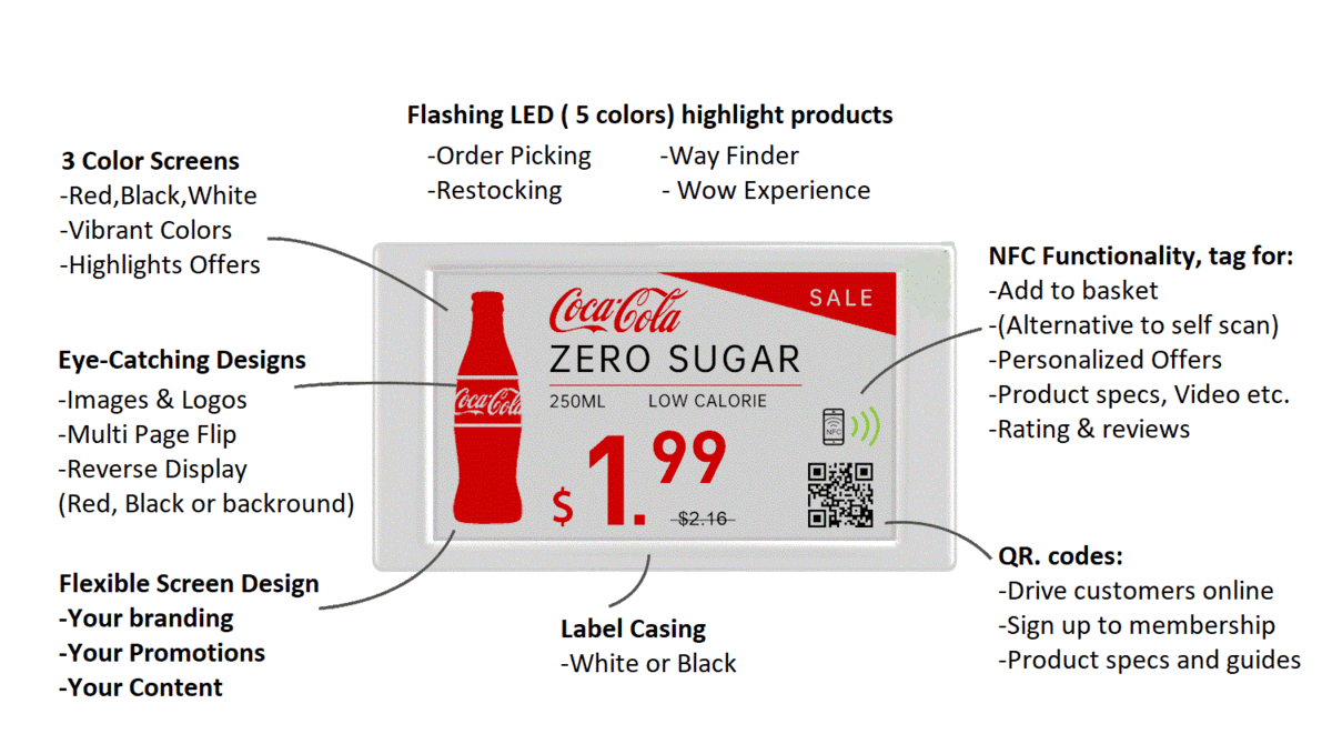 Electronic Shelf Labels (ESLs) enable retailers to update prices automatically, in real-time across the store, eliminating days of tedious and error-prone manual work. With ESLs, retailers can increase pricing efficiency and accuracy, optimize click and collect, and simplify replenishment. Store operators can quickly react to market prices and easily synchronize pricing to keep up with the online competition. ESLs allow customers to immediately see the correct price and get personalized, in-depth product information creating a seamless in-store and online shopping experience with price transparency.